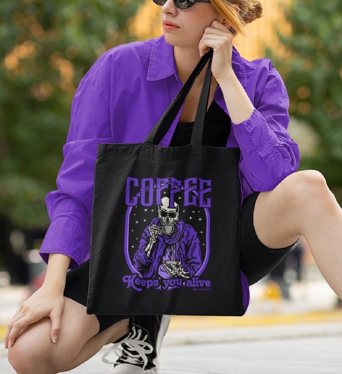 Die Retro Comic Einkaufstasche für Kaffeefans, den auch ein Sensenmann muss wach bleiben und das macht er mit einer heißen Tasse Kaffee!