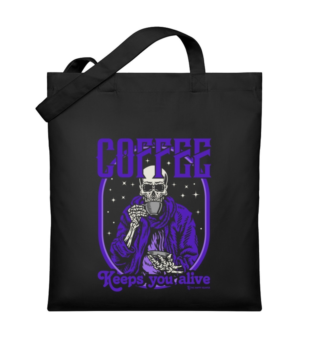 Der Happy Grim Reaper trinkt seinen natürlich Schwarz! Wie auch sonst? Mit diesem coolen Retro Comic Jutebeutel kannst du auf jeden Fall Stil beweisen und zeigen das auch du einer guten Tasse Kaffee nicht abgeneigt bist. Nutze die Kräfte des Koffeins um am Leben zu bleiben!