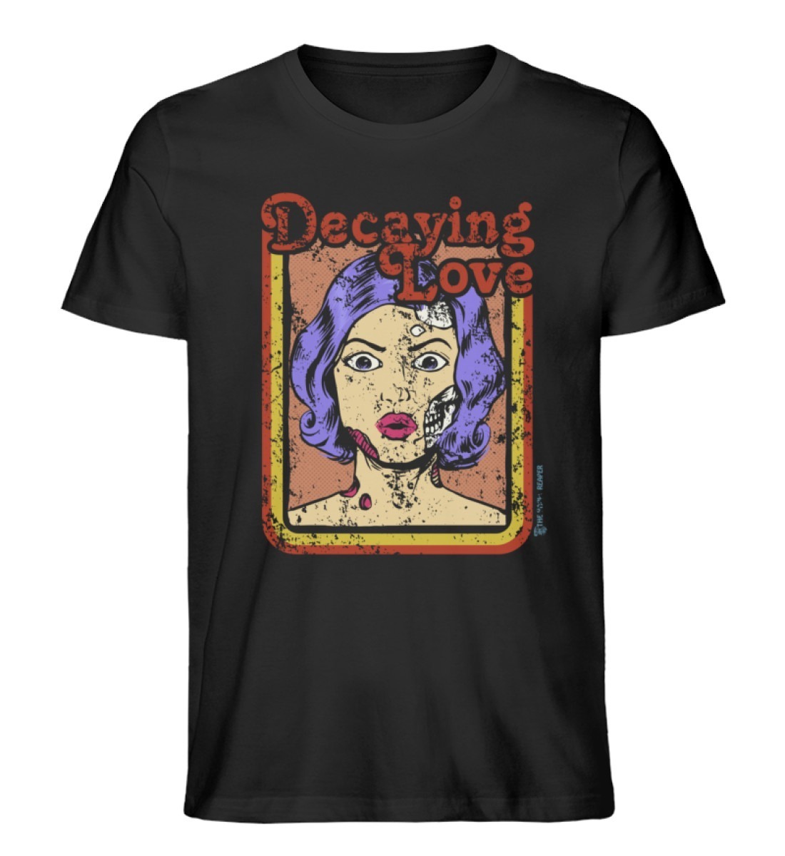 Gerade im Bereich der Horror Comics ist ein Happy End nicht selbstverständlich! Das Liebe vergehen kann oder über den Tod hinausgeht dafür steht dieses Motiv aus der Sensenmann Reihe. Der glückliche Reaper macht euch nämlich klar das Liebe verrottet wie das Fleisch an den Knochen. Zeig Stil mit diesem nerdigen Retro Shirt das an die Comics der 70er erinnert.